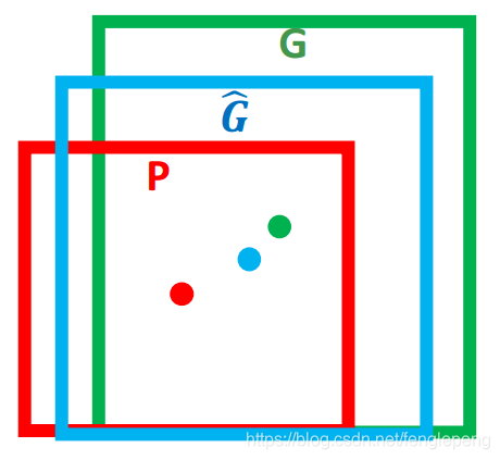 对于窗口一般使用四维向量 $(x,y,w,h)$ 来表示, 分别表示窗口的中心点坐标和宽高。 对于下图, 红色的框 P 代表原始的 Proposal, 绿色的框 G 代表目标的 Ground Truth, 我们的目标是寻找一种关系使得输入原始的窗口 P 经过映射得到一个跟真实窗口 G 更接近的回归窗口 $\hat{G}$。
